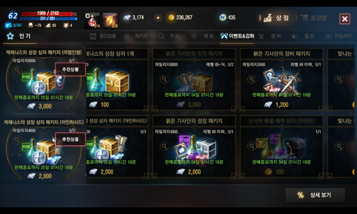 그렇게 모은 다이아로 "상점 -> 이벤트&강화 -> 붉은 기사단의 성장 패키지"를 구매합니다. 아이템을 살까 생각했는데 빨리 오만을 가야지 다이아를 더 벌 수 있으니 레벨업에 투자하기로합니다.