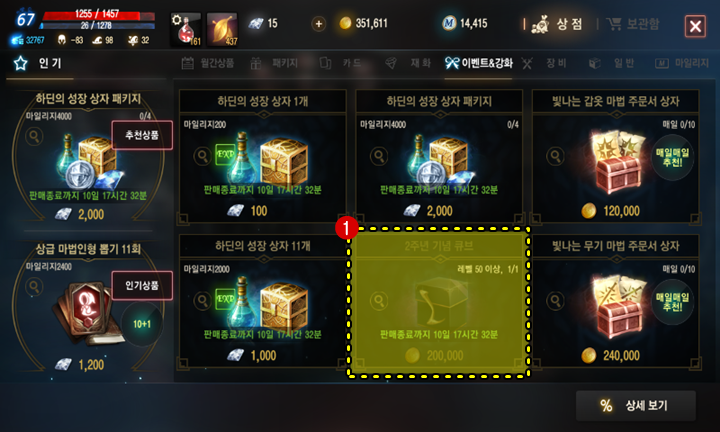 상점 - 이벤트&강화 - "2주년 기념 큐브" 20만 아데나로 구매하시면됩니다. 구입 레벨 제한은 50레벨이고 "창고 보관이 가능하나 큐브를 사용 한 뒤에는 보관이 불가능합니다" 경험치 버프를 먹일 캐릭터로 상자를 사용하는게 좋겠죠.