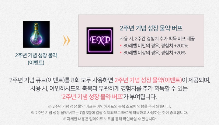 그리고 마지막 8단계에서는 "2주년 기념 성장 물약"을 보상으로 받을 수 있습니다. 캐시로 구매가 가능했던 성장 물약보다는 약하지만 80레벨 이하의 유저들에게는 나름 괜찮은 옵션이라 생각합니다. 80이하는 +200% 경험치 추가 획득이고 80이상에서는 20%로 추가 획득입니다. 해당 버프는 큐브가 사라지는 7월 3일 정기점검 이후 같이 삭제됩니다.