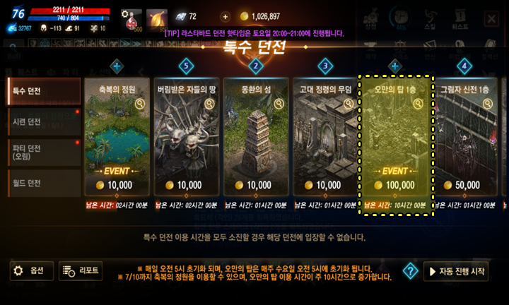 오만의 탑 시간 추가 (7월 10일 정기 점검 전까지)