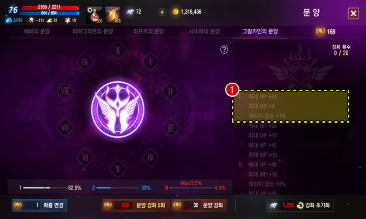 기본적으로 HP와 MP를 증가시켜주는데 단계가 올라가면 "대미지 감소" 옵션이 추가됩니다. 고급 옵션이라서 라인이나 싸움 좋아하시는 분들은 과금좀 하겠다 싶네요. 역시나 무과금은 사냥하다가 모이는 포인트로만 깔짝깔짝 강화해야죠.