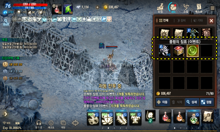 60레벨 이상의 유저가 몬스터 100마리를 잡으면 정령의 전쟁에 참여할 수 있는 코인을 보상으로 받습니다. 정령의 전쟁은 하루에 2번 " 13시 3분 / 17시 3분"에 입장이 가능하고 서로 4개의 진영을 나눠서 방해하고 대정령을 처치하는 방식의 이벤트 던전입니다만.... 저 시간에는 수동 플레이가 불가능해서 저는 그냥 패스하려구요. 이벤트 보상은 영웅무기상자~명코 등등입니다.
