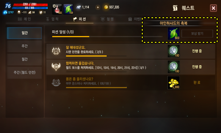 일간 미션 달성시 보상으로 받던 300 아인하사드에서 두배로 올라간 600 아인하사드를 보상으로 받을 수 있습니다. 월드보스 귀찮아서 패스했는데 저녁에는 꼭 해야겠군요.