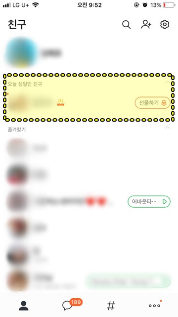 카톡 친구 리스트에서 "오늘 생일인 친구" 목록이 업데이트됐네요. 생일 케이크 아이콘과 선물하기 버튼이 활성화되서 쉽게 카톡 선물하기 기능으로 선물을 보내 줄 수 있습니다. 다만 업무적으로 연결된 경우 이런 사적인 부분들의 알람이 불편한 경우가 있습니다. 그래서 "오늘 생일인 친구" 알람을 꺼보도록 하겠습니다.