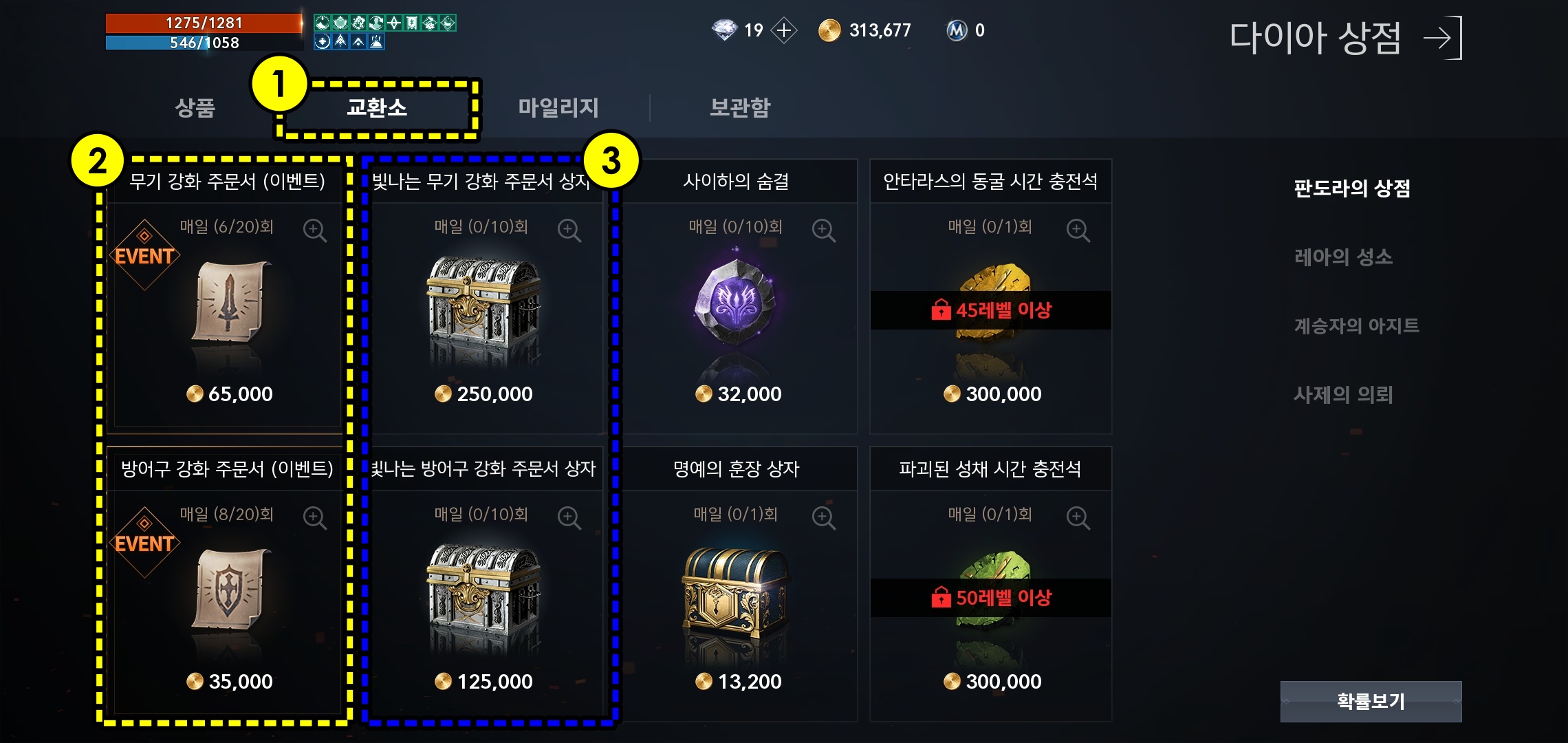 교환소 탭을 선택해서 무기 강화 주문서 / 방어구 강화 주문서 (이벤트)를 구매할 수 있습니다. 앞서 말했듯이 이벤트 기간이라 무기 강화 주문서를 65.000원 방어구 강화 주문서를 35.000원에 구입할 수 있습니다. 이벤트가 끝나면 해당 아이템 목록들은 사라지고 3번 영역의 "빛나는 무기 강화 주문서 상자" 와 "빛나는 방어구 강화 주문서 상자"만 판매하게됩니다.