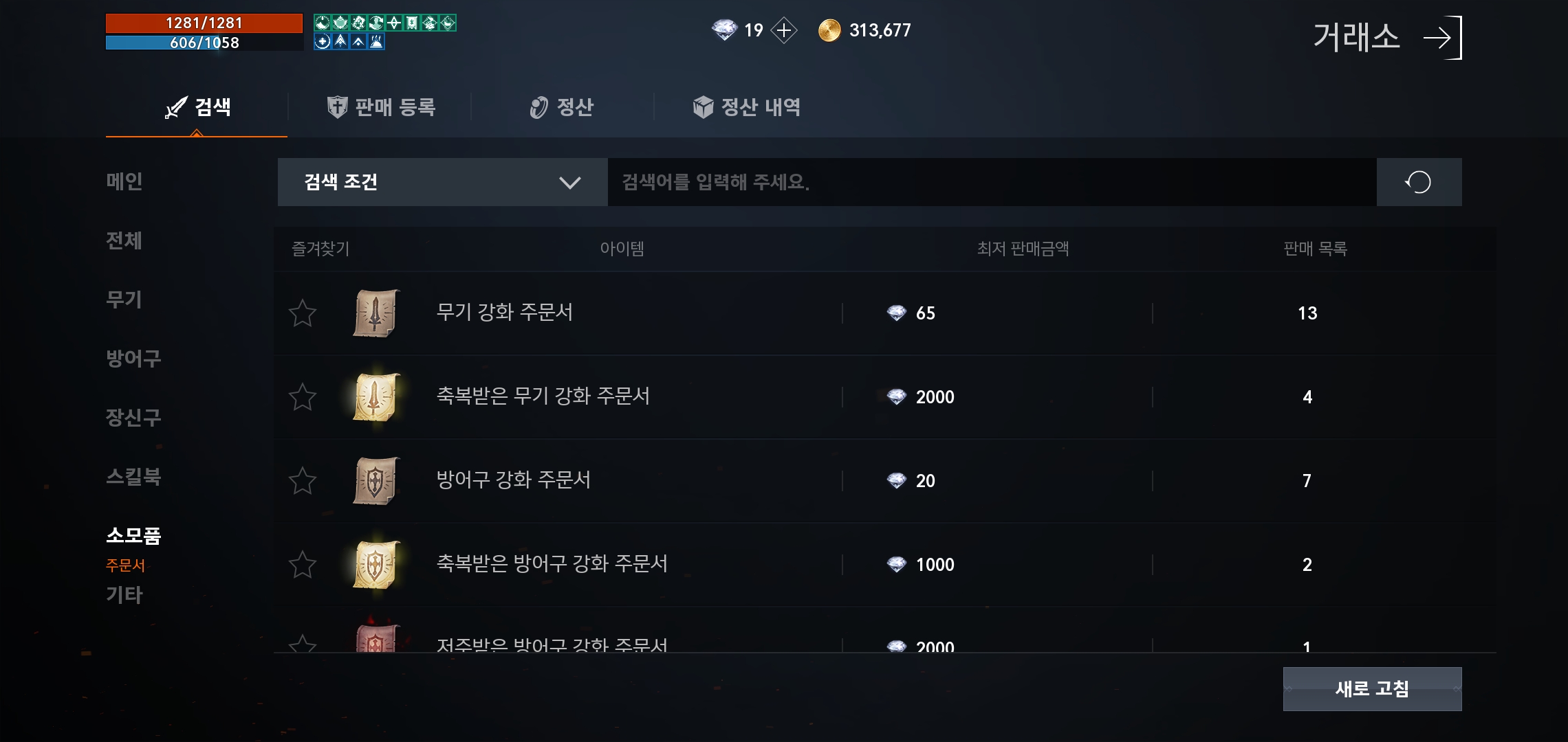 거래소에서 "소모품 -> 주문서" 순서로 이동하면 등록된 강화 주문서들을 확인할 수 있습니다. 무기 강화는 65다이야 / 방어구는 20다이아로 등록됐는데 실제로 거래되는 가격인지는 모르겠습니다. 급하면 과금러들이 구매는 하니깐 어쨌거나 무과금은 사용하지 말고 거래소에 등록한 뒤 다이아 버는게 장땡입니다.
