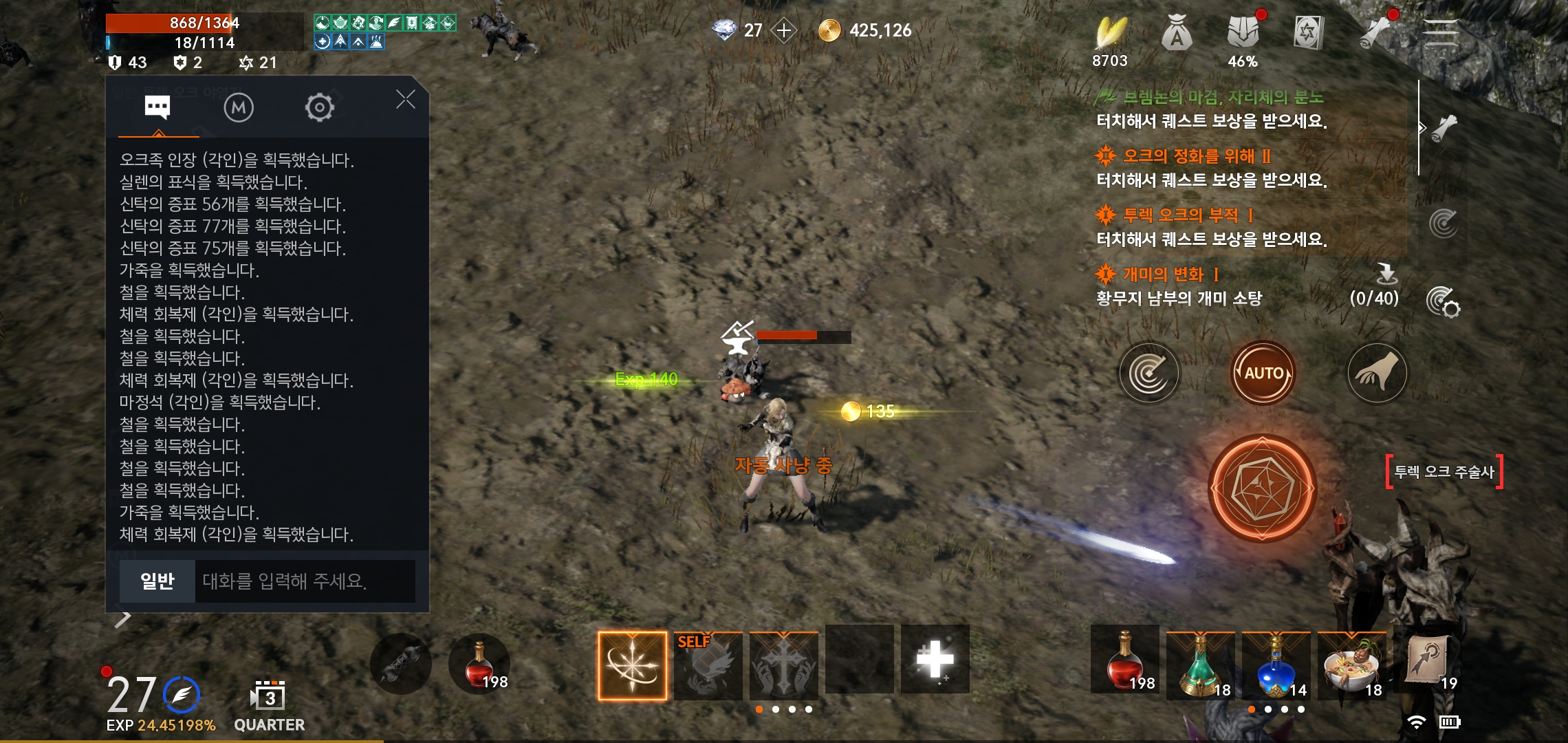 리니지M과 비슷하게 리니지2M도 역시나 재료 앵벌이를 해야합니다. 과금하면 거래소에서 그냥 구입하면 땡이지만 무과금들은 거래소 이용할 다이아가 초반에 없으니 이렇게 노가다로 기본 재료들을 수급해서 고급 재료로 만들어 판매하거나 자신이 입을 방어구나 무기를 제작하는 방식으로 리니지2M을 플레이합니다.