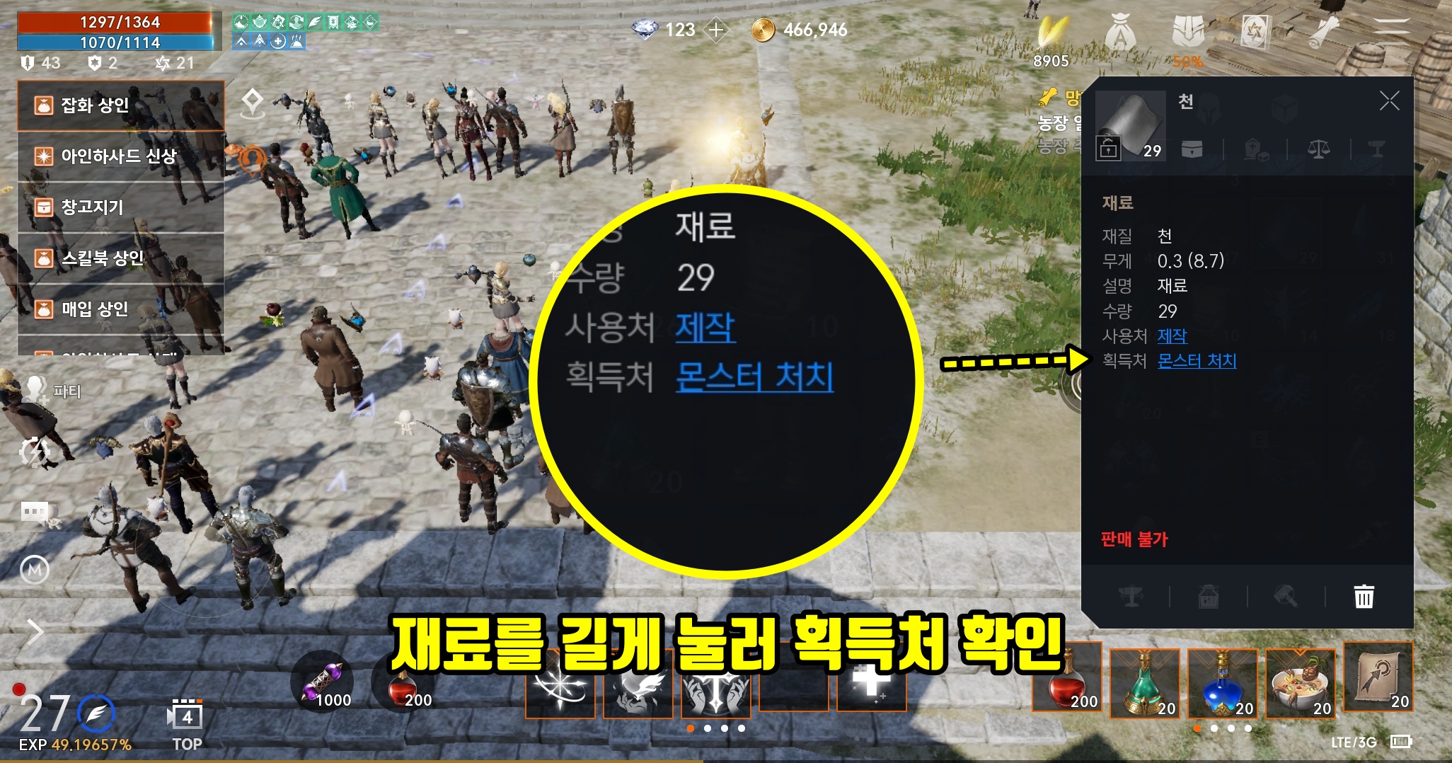 재료가 어느 곳에서 나오는지 궁금한 경우에는 인벤토리에서 재료를 선택한 뒤 길게 누르면 우측에 아이템 설명 팝업창이 나타납니다. 그 중에 "획득처"를 선택하면 몬스터의 이름과 지역을 알 수 있습니다. 재료뿐만 아니라 다른 아이템들도 길게 눌러서 획득처를 눌러 확인이 가능합니다.