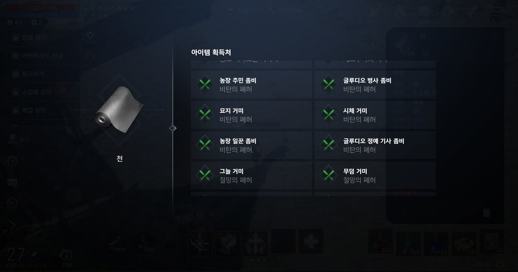 리니지2M 오브를 사용하는 클래스라서 방어구는 대부분 천이나 가죽을 이용해서 제작합니다. 고급천은 천 10개와 5만 아데나가 필요하기에 꽤나 많이 모아야합니다. 재료중에서 천을 주로 드랍하는 장소는 "절망의 폐허"와 "비탄의 폐허" 두 곳 입니다. 몬스터들도 많고 적당히 약해서 장시간 사냥하기 괜찮습니다.