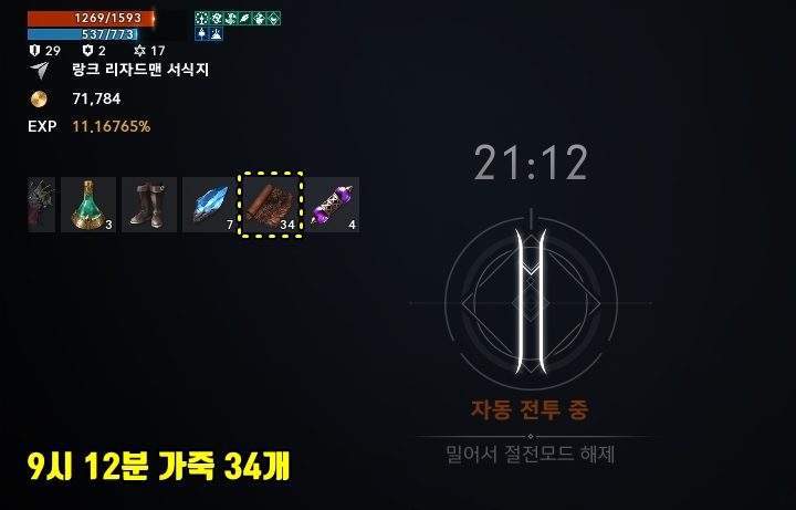 52분이 지났을때 가죽은 총 34개 모였습니다. 대충 1시간에 30~40개로 생각하면 괜찮겠네요.