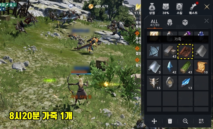 8시 20분경 가죽 1개로 노가다를 시작했습니다. 뭐 그냥 자동사냥 돌려놓는거지만요. 카르미안 세트를 제작해야하는데 총4개 부위 30개씩의 가죽이 필요해서 120개의 가죽을 모아야합니다.