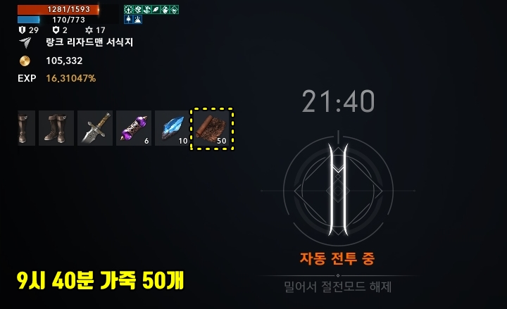 저렙존이니깐 부담없이 사냥을 하는데 주의할 부분은 "아이템 획득" 설정을 "고급" 등급부터 획득하는게 좋습니다. 가끔 일반 등급의 아이템들 엄청 주워먹고 재료나 다른 템들 못 먹는 경우가 있어서 장시간 자동사냥 돌리면서 재료 모을 경우는 고급 등급부터 획득으로 변경해주세요.