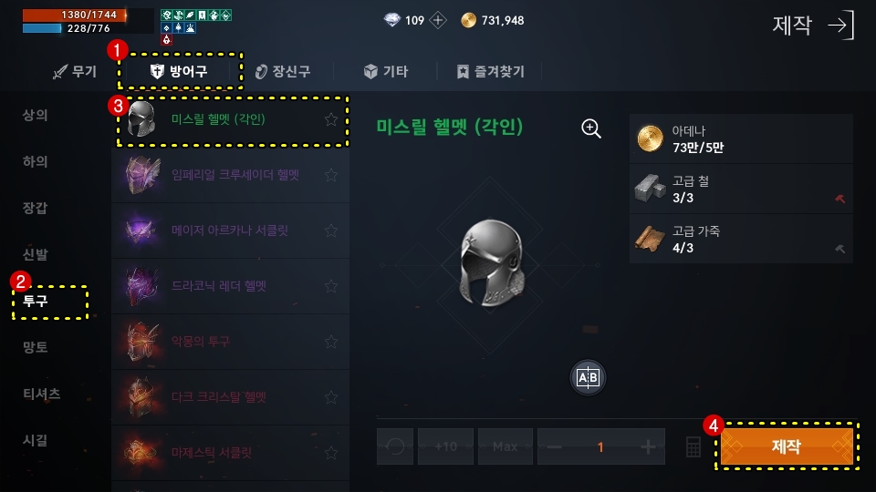 메뉴에서 제작 -> 방어구 -> 원하는 부위 -> 미스릴 (카르미안) 방어구 선택 -> 제작 순서로 4셋의 베이스 방어구 아이템을 제작할 수 있습니다.