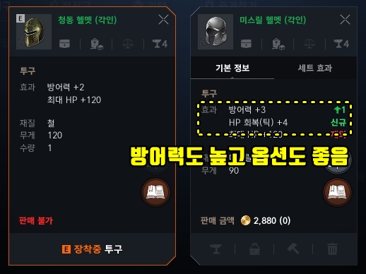 신탁 퀘 보상 방어구와 제작 미스릴 방어구를 비교한 모습입니다. 기본 옵션도 방어력이 +1이고 hp 회복 옵션도 있어서 보상 방어구 아이템보다 더 좋습니다.