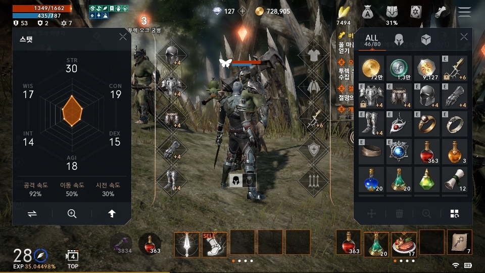 총 4개의 부위니깐 140만 아데나에 재료 240개 필요하겠군요. 아데나는 어느정도 사냥과 퀘스트로 모이니깐 우선 문제는 재료가 더 급합니다. 레벨이 낮고 재료를 주는 사냥터를 골라서 3~4시간 정도 재료 노가다를 해야합니다. 켜놓고 다른일 보는게 좋겠죠.