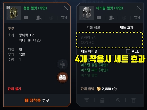 그리고 거기에 추가로 4개의 방어구를 모두 착용하면 ( 투구/갑옷/장갑/신발) 방어력 +3과 con+2의 세트 옵션 효과를 누릴수 있습니다. 보상 방어구와 비교가 안되는 성능이라 무조건 제작입니다.