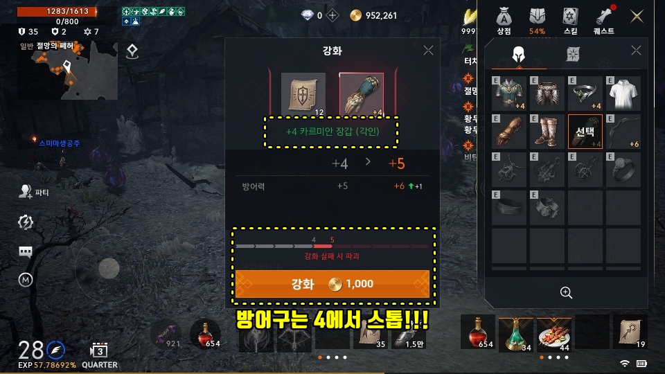 방어구는 재료를 모아서 제작했다면 "방어구 강화 주문서"를 구입한 뒤에 +4까지만 강화를 합니다. 역시나 4->5 강화 하는데 실패하면 아이템이 파괴니깐 부질없어집니다. +4까지 명심!!! (아이템마다 안전 강화의 기준이 다릅니다. 캐시 장신구는 +0에서 +1로 강화하는데 실패 확률이 있으니 아이템을 길게 눌러서 이름 옆의 숫자를 확인해주세요)
