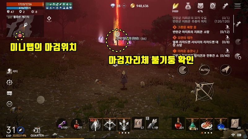 공지로 위치를 알려주지만 바로 이동 할 수 없기에 해당 마을이나 사냥터로 순간이동해서 달려가야합니다. 이때 미니맵에서 마검의 위치를 확인할 수 있습니다.