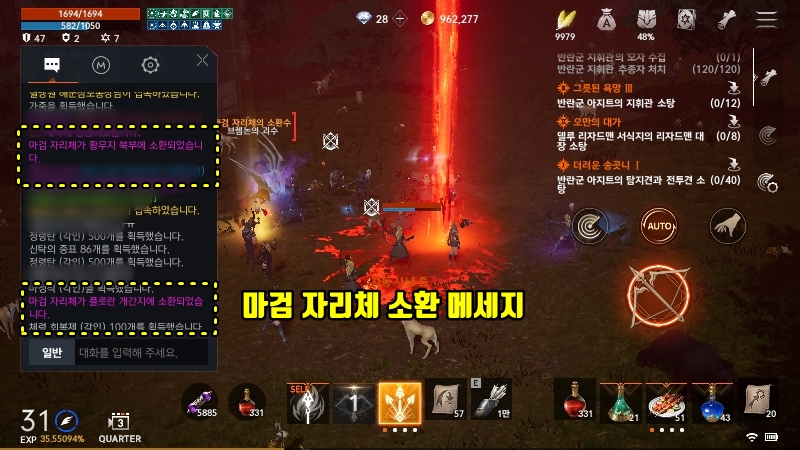 마검자리체는 랜덤으로 등장합니다. 시간또한 랜덤이라서 기다려서 잡는 방식보다는 "월드채팅"으로 공지처럼 마검자리체의 등장을 알려주는 메세지가 출력됩니다. " XXX지역에 마검자리체가 등장했습니다" 이런식으로 말이죠. 그러면 맵을 열고 불기둥을 찾아서 가장 가까운 위치로 텔레포트한 뒤에 달려서 마검이 소환된 장소로 가면됩니다.