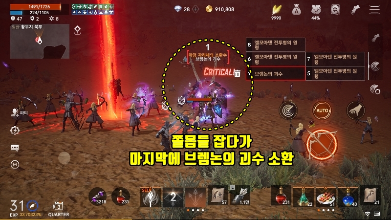 물론 중간에 잡몹(?)들이 계속 소환되는데 이들을 잡으면 신탁의 증표라던지 자리체의 파편등의 아이템도 드랍합니다. 마검이 내려온 뒤부터 잡몹들을 소환하고 마지막에 브렘론의 괴수가 나오니깐 마검 자리에서 계속 자동사냥을 돌리면됩니다.