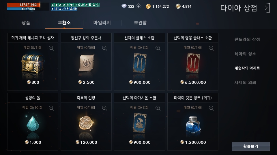 이 방법은 추천드리지 않지만 여기서도 장신구 강화 주문서를 구매할 수 있다! 정도로 봐주시면 좋겠습니다. 신탁의 증표는 아껴서 스킬북 사는 용도로 쓰세요. "교환소 -> 계승자의 아지트-> 장신구 강화 주문서 2,500 신탁의 증표로 교환" 입니다. 추천 방식은 아니니깐 주의하시구요!