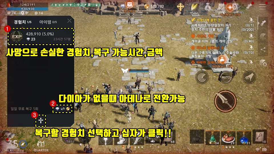 십자가를 누르면 이렇게 왼쪽에 팝업창 하나가 나타납니다. 경험치와 드랍한 아이템 목록을 확인하는 창인데 경험치를 선택하고 하단의 십자가 마크 (3번)을 누르면 무료로 복구가 가능합니다. 물론 하루에 총 5번을 모두 사용하면 그때부터는 다이아나 아데나 (2번 버튼을 눌러서 전환)로 복구를 해야합니다.