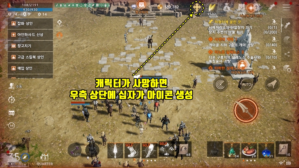 캐릭터가 사망한 경우 우측 상단의 십자가 마크가 생겨납니다. 이를 보고서 회복의 신녀로 달려가지 마시고 이 십자가를 눌러보세요.
