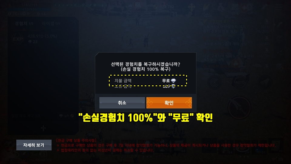 손실 경험치100%와 지불 금액이 무료임을 확인 한 뒤에 "확인" 버튼을 눌러서 경험치를 복구합니다. 이처럼 회복의 신녀 앞으로 꼭 가지 않더라 아이템과 경험치를 복구 할 수 있습니다. 하루에 5회 한정이니깐 너무 무리한 사냥터에서 사냥하기 보다는 안정적인 사냥터에서 오랜시간 앵벌이하는게 무과금에게는 좋습니다. 그럼 모두 리니지2M 열렙 득템하세요 :-)