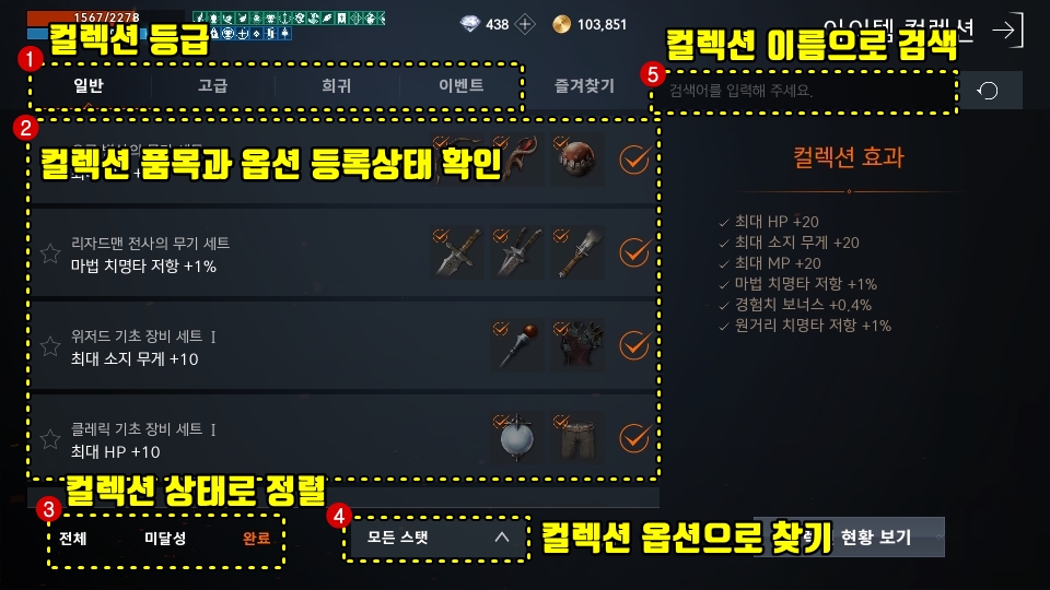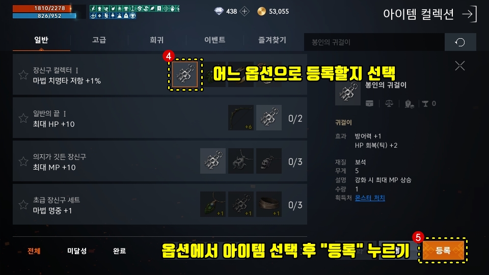 이렇게 습득한 아이템들 (일반 등급이라 다 버리지 마시고 기본 컬렉션은 챙겨야합니다. )컬렉션에 등록하다보면 HP+10등의 비루한 옵션들이 모여서 자신의 캐릭터를 강하게 만들어줍니다.