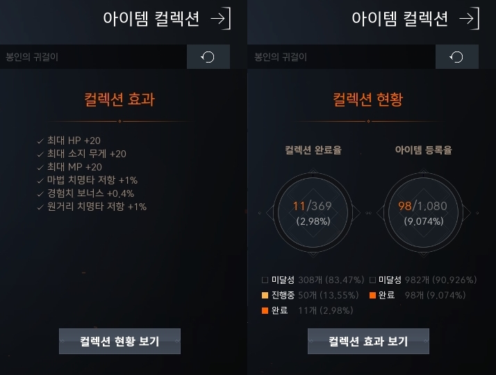 컬렉션 : 게임상의 아이템을 자신의 컬렉션에 등록하고 영구적인 (혹은 기간제로) 혜택을 받는 콘텐츠. 예를 들어 단검과 신발을 컬렉션 등록하면 힘스탯 +1 혜택을 얻는 방식