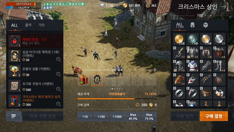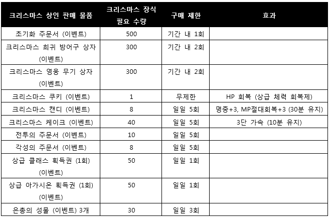 크리스마스 이벤트 상인이 판매하는물품입니다. 크리스마스 쿠키/캔디/케이크는 구매할 필요가 없어보이고 무과금은 뭐 싸움도 안하니 전투나 각성 주문서도 패스합니다. 상급 클래스 획득권 / 상급 아가시온 획득권 / 은총의 성물 / 희귀 방어구 상자 / 영웅 무기 상자 / 초기화 주문서 이렇게만 구매하면 될듯합니다.