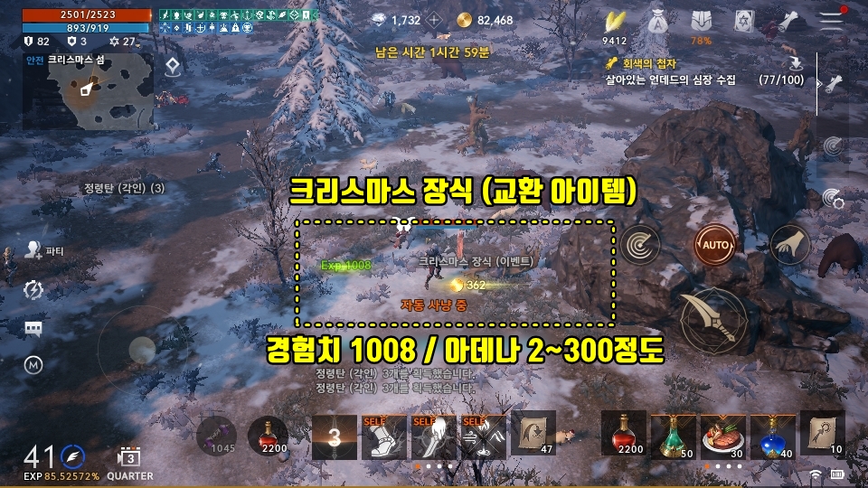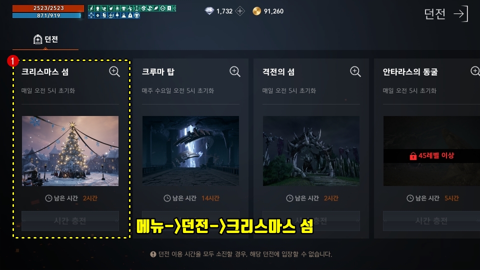 게임상의 메뉴에서 던전을 선택하고 새로 생성된 "크리스마스 섬"에 1만 아데나를 지불하고 입장합니다. 이제 여기서 2시간 사냥이 가능하며 최대한 크리스마스 장식을 많이 모아야합니다.