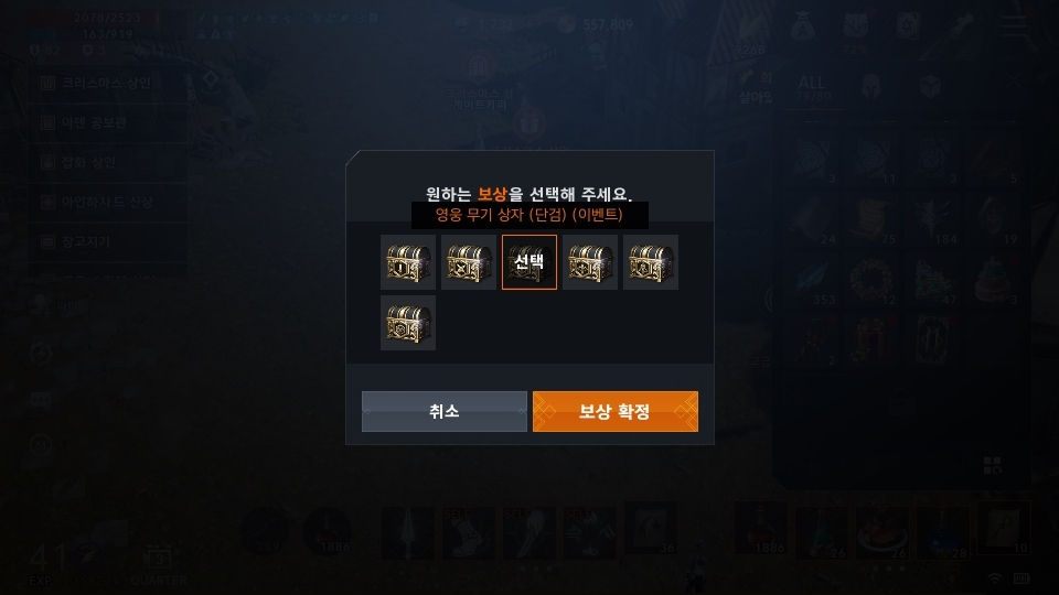 영웅 무기 상자의 경우는 클래스 랜덤으로 나오는게 아니라 이렇게 단검이나 한손검등 원하는 클래스를 선택해서 보상을 받을 수 있습니다. 궁수가 받아서 단검 클래스 선택하면 단검 아이템이 나오겠죠.