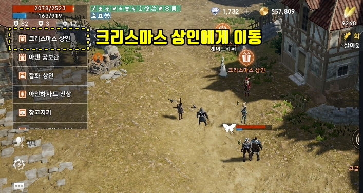 2시간 알차게 사냥을 했다면 마을의 "크리스마스 상인" 엔피씨에게 이동합니다. 왼쪽 상단의 맵 옆의 사람모양 아이콘을 클릭하면 엔피씨 이름들이 출력되니 거기서 선택하면 자동으로 이동합니다.