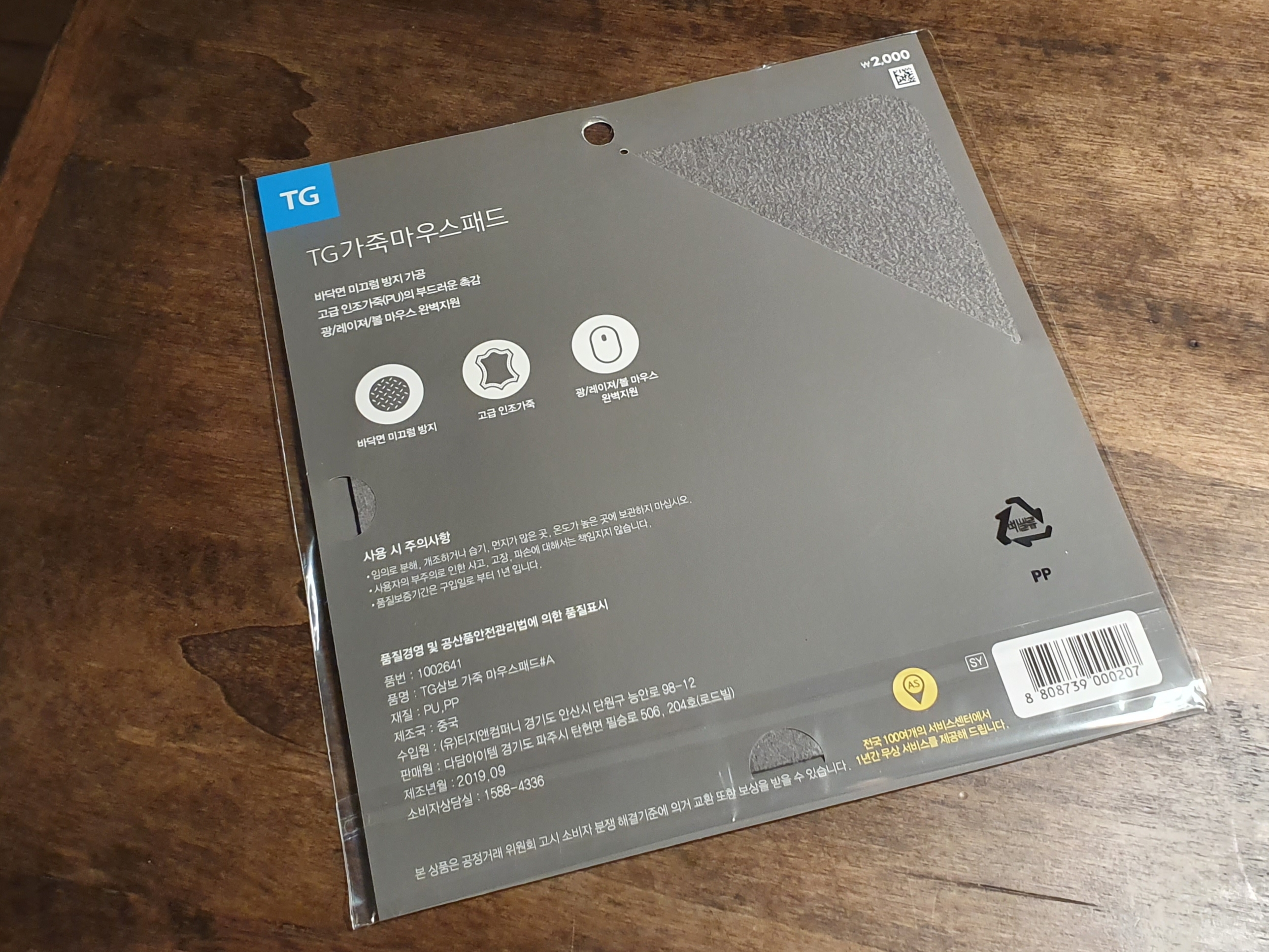 앞서 말했던 이유로 그래픽이나 다른 디자인이 첨가된 제품은 제외하고 TG가죽 마우스 패드가 가장 심플하고 튀는 부분이 없어서 골랐습니다. 가격은 2.000원 같은 크기의 다른 제품들은 1.000원정도인데 이녀석은 두배군요..-_-;; 우측 상단의 영문은 없었으면 더 좋았겠다만...