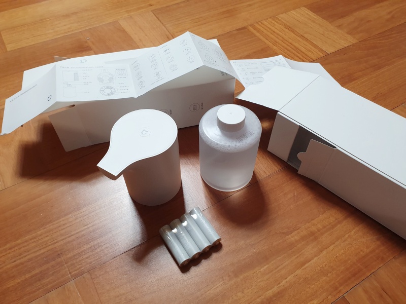 샤오미 손세정기의 구성품은 본체 / 세정액통 / 건전지 / 설명서로 매우 간단합니다. 설명서가 중국어인데 그림만봐도 이해될 수준이라 딱히 어려운 부분은 없습니다.