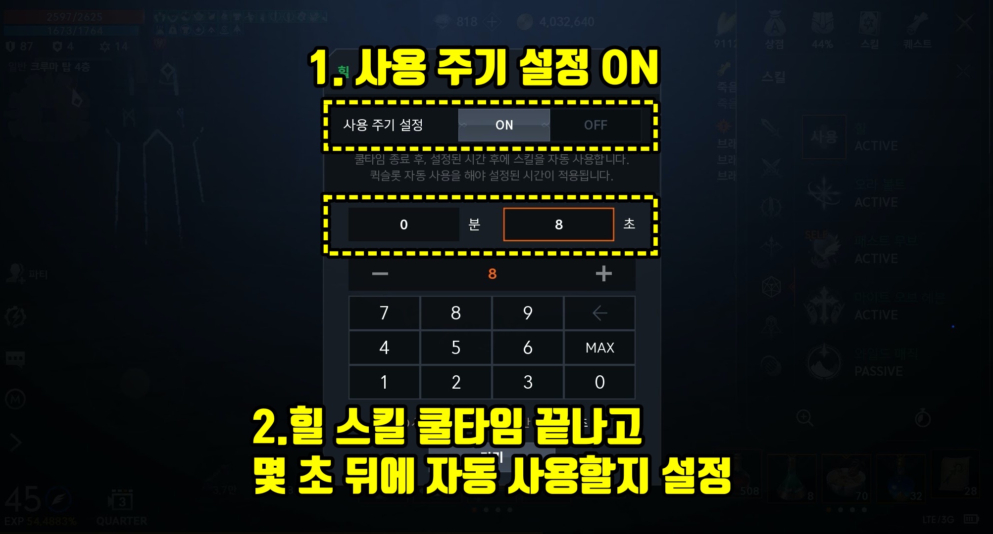 첫번째로 "사용 주기 설정"을 ON으로 변경해야 자동 사용 시간을 설정할 수 있습니다. 그리고 하단의 숫자 패드에서 분이나 초를 골라서 입력하고 닫기를 누르면 힐 스킬의 자동 설정이 적용됩니다.