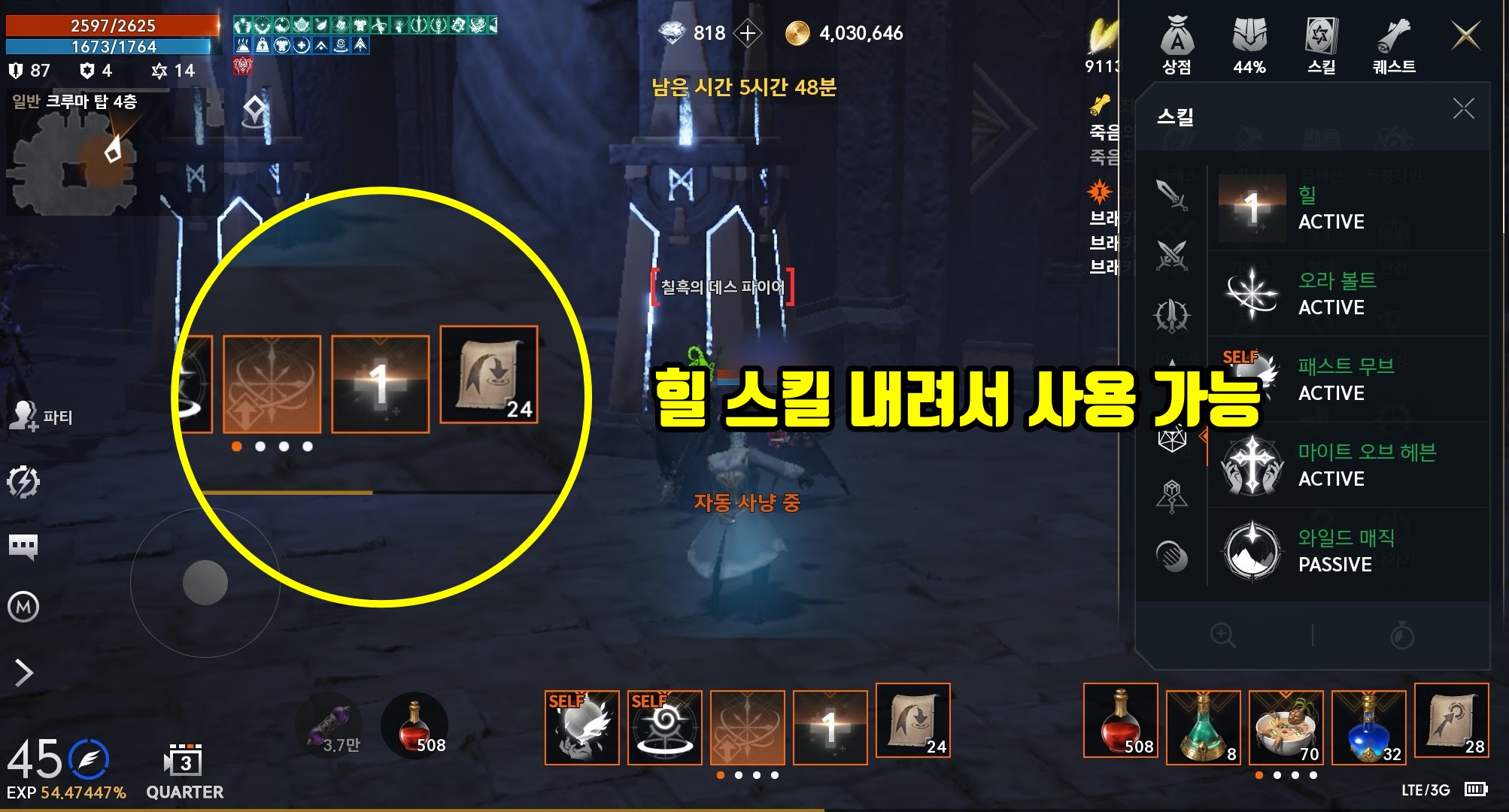 리니지2M 업데이트로 힐 스킬이 스킬창에서 자동사용 스킬처럼 밑으로 내릴 수 있게 변경되었습니다. 지금은 힐 스킬을 자동사용으로 내려 놓은 상태라서 쿨타임이 끝나면 계속 힐을 쓰고 있는 상태입니다. 이러다가 사냥은 안하고 힐 스킬만 계속 쓰면서 멍때릴 것 같은 상황인데 이는 "자동 사용 시간 설정"을 하지 않아서 발생하는 문제입니다.