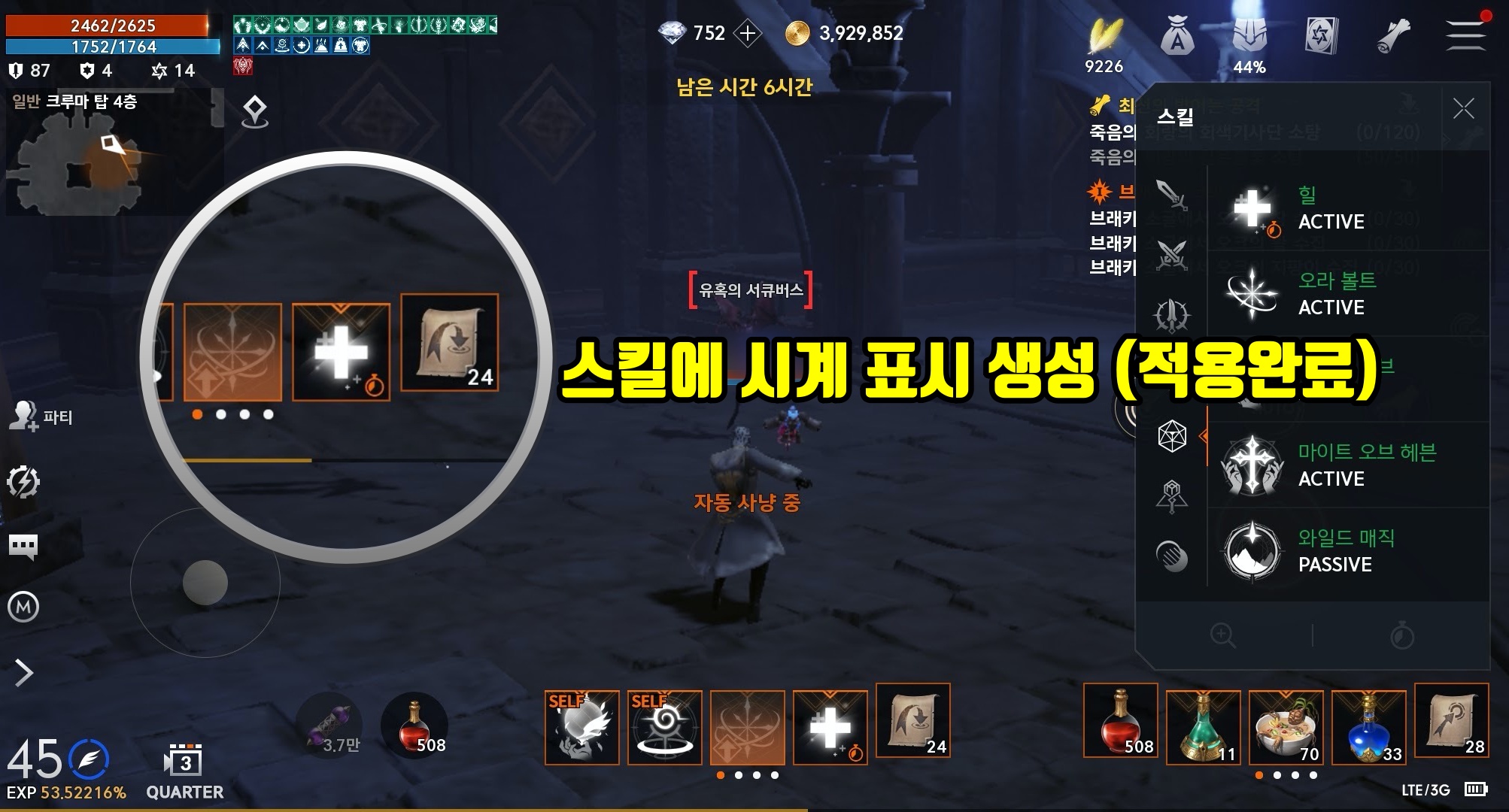 이제 자신의 오브 캐릭 스킬창을보면 힐 스킬 옆에 시계 모양의 아이콘이 생긴 것을 확인할 수 있습니다. 이는 스킬의 사용 주기 설정이 적용된 상태라는 표시입니다. 정상적으로 자신이 적용한 시간마다 힐 스킬을 사용하는 모습을 볼 수 있습니다.