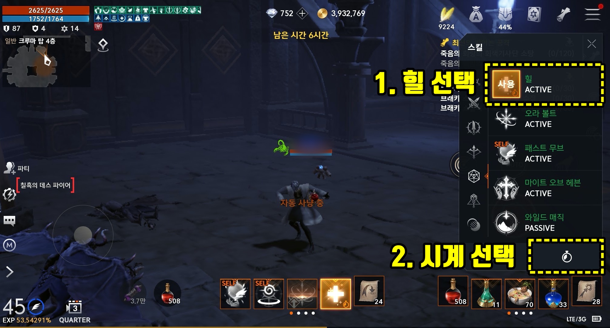 스킬창을 열어서 "힐" 스킬을 선택하면 스킬창 하단에 " 시계" 모양의 아이콘이 활성화됩니다. 그 아이콘을 눌러서 스킬을 몇 초마다 자동으로 사용할지를 설정해야합니다.