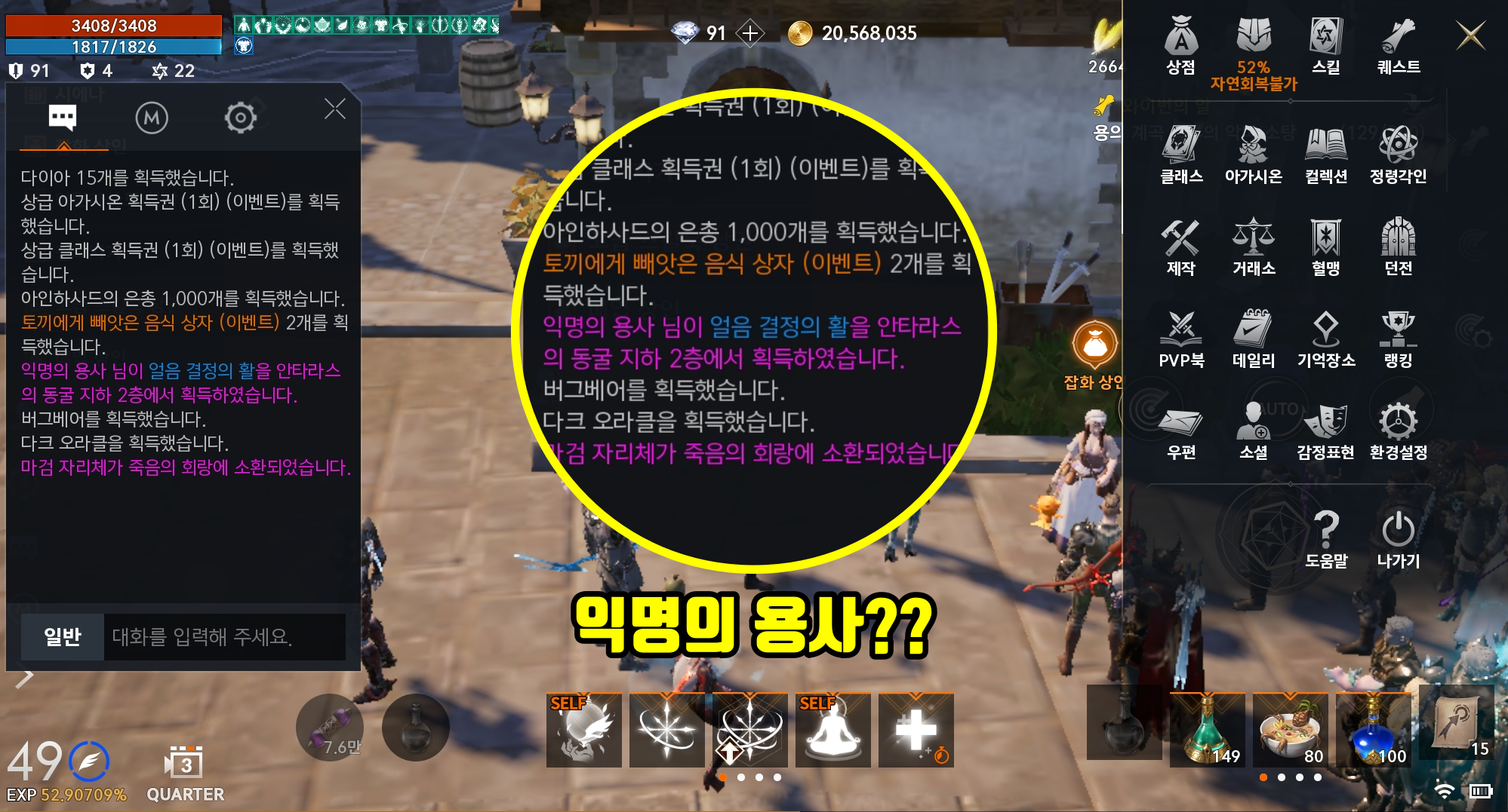이렇게 전체 메세지로 익명의 유저가 아이템을 획득했다고 출력됩니다. 같은 사람이 계속 획득하는게 아니니까 오해는 하지 마세요 :-)