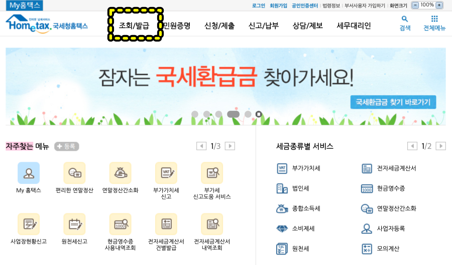홈텍스 메인화면에서 (조회는 따로 로그인하지 않아도 가능합니다.) 첫번째 메뉴인 "조회/발급"을 선택합니다.