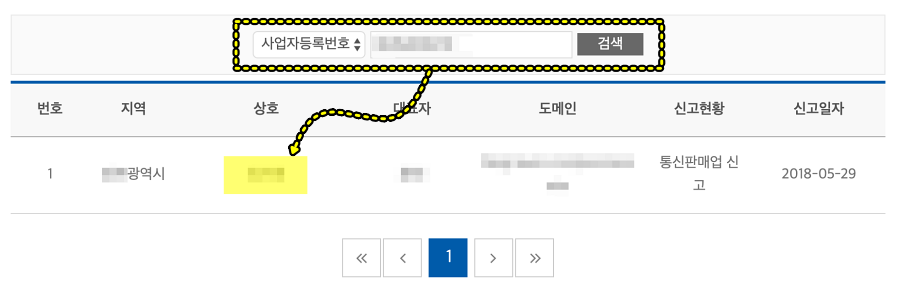 사업자등록번호를(사업자번호 외에 통신판매번호,상호,대표자 이름으로도 검색이 가능합니다.) 입력하고 검색을 누르면 지역 / 상호 / 대표자 / 도메인 / 신고현황 / 신고일자의 정보가 간략하게 출력됩니다. 여기에서 조금더 자세한 정보를 보고싶으면 검색한 사업자의 "상호"를 누르면 통신판매사업자의 추가 정보를 확인할 수 있습니다.