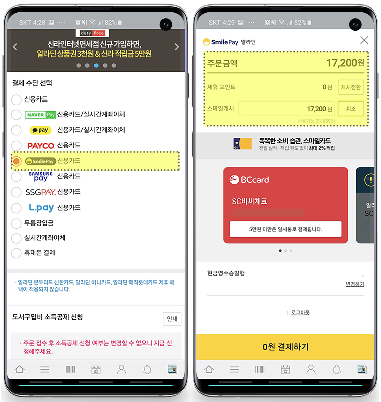 사이트에서 구매할 때 스마일캐시를 적용하는 부분이 있습니다. 그곳에서 원하는 금액만큼 선택해서 입력이 가능합니다. 반은 스마일캐시로 반은 카드로 결제가 가능하니 활용도가 매우 높습니다.