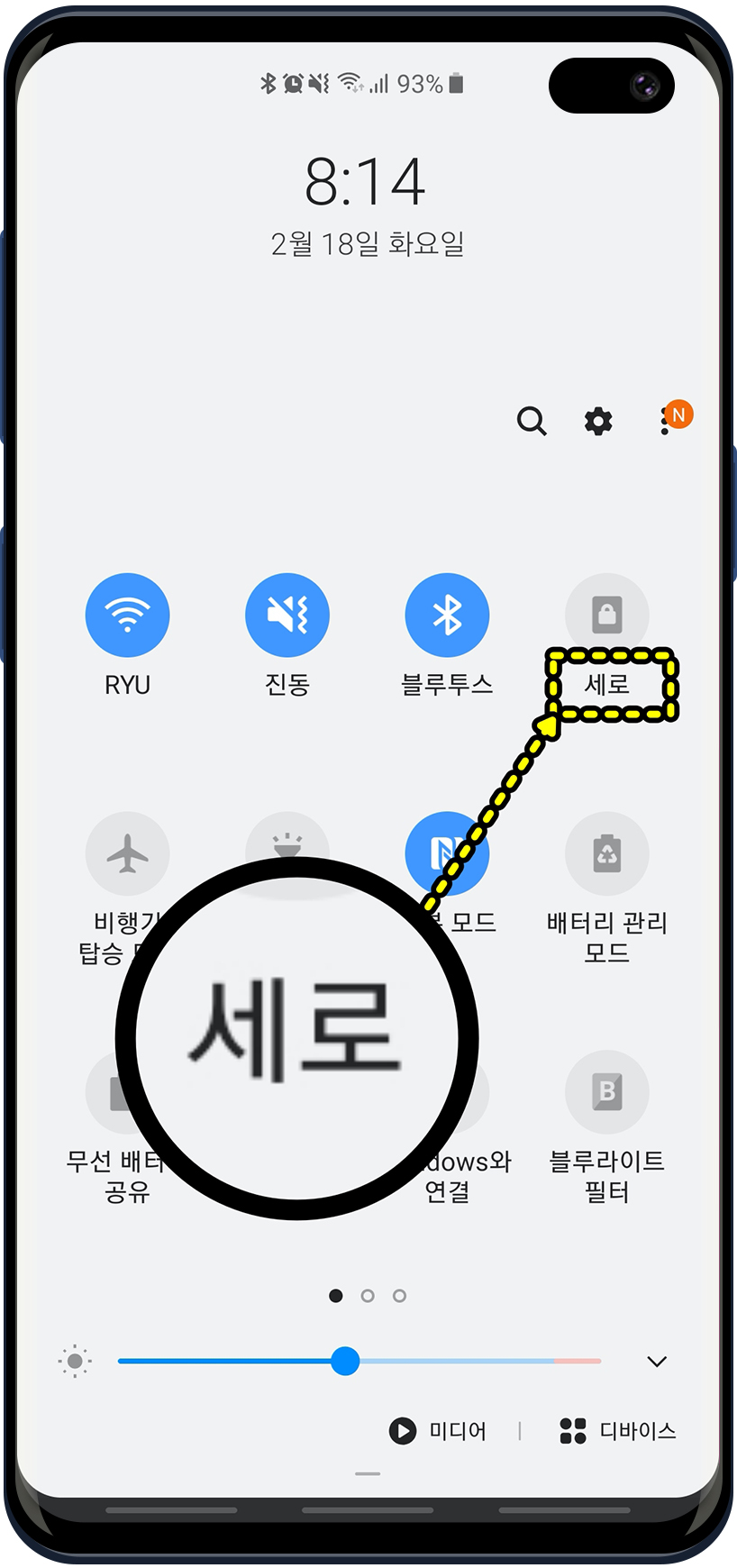 빡침의 원흉인 우측 하단의 저 아이콘이 바로 "수동 회전 버튼"입니다. 수동으로 화면을 회전시켜준다는 좋은 의미인데 사용하면서 그리 유용하게 느껴지지는 않더군요. 갤럭시s10 스마트폰의 상단을 내려서 "세로" 글씨를 터치합니다. 세로 아이콘을 터치하면 자동회전으로 전환이고 해당 옵션들을 보려면 "글씨"를 눌러야합니다.