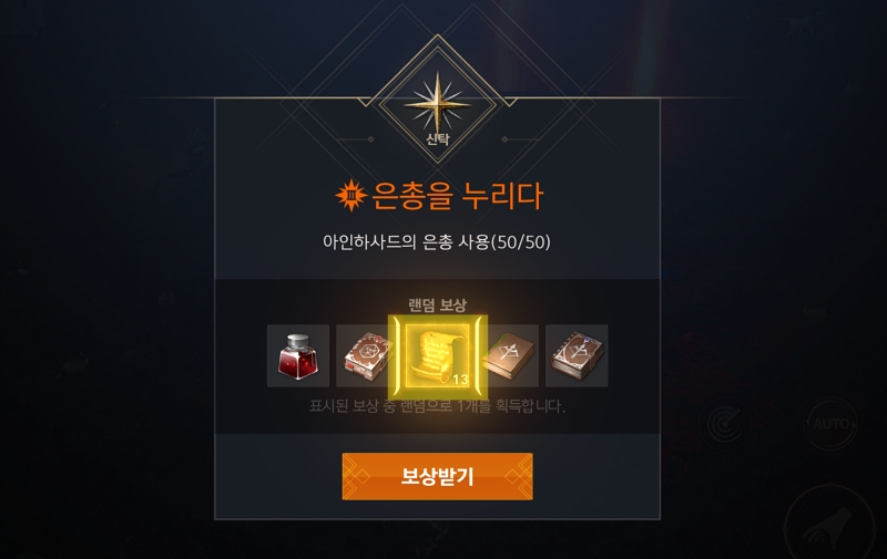 바로 이렇게 말이죠. 신탁서 퀘스트 완료하고 13~14장의 마력이 깃든 양피지를 획득합니다. 하루에 1개씩 신탁서를 구매하고 클리어할 수있으니 최소 1개의 이벤트 컬렉션 제작에 필요한 양피지 (200개)는 얻을수있습니다. 그렇게 매일 신탁서를 진행해도 부족하게되는데 그 다음으로 편하고 쉽게 마력이 깃든 양피지를 얻는 방법은 약간의 "다이가"가 소모됩니다.