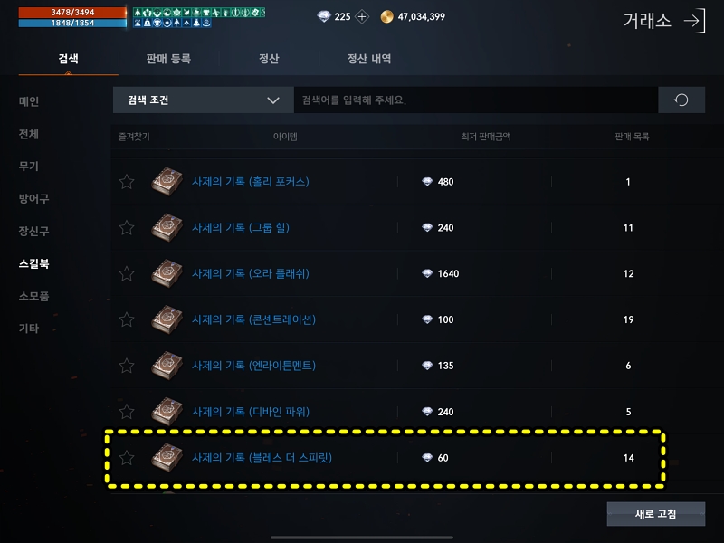 2. 스킬북을 분해하면 "마력이 깃든 양피지"를 획득할 수 있습니다. 일반 등급의 스킬북은 10개의 양피지를 희귀 등급의 스킬북은 100개의 양피지를 얻습니다. 일반 등급 스킬북은 최소 10다이아이니 가성비는 저렴한 희귀 등급의 스킬북을 분해하는게 맞겠죠. 거래소에서 저렴한 희귀 스킬북을 찾아봅니다. (일반 상점에서 판매하는 스킬북은 분해 안됩니다!)