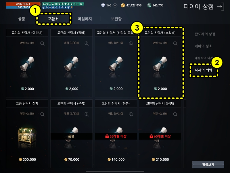 1. 상점 -> 교환소 -> 사제의 의뢰 ->교단의 신탁(스킬북)를 구매합니다. 스킬북 신탁을 구매하는 이유는 보상목록에서 꽝이 "마력이 깃든 양피지 13~14개"라서 거의 대부분 마력이 깃든 양피지를 획득하게됩니다.-_-;;;