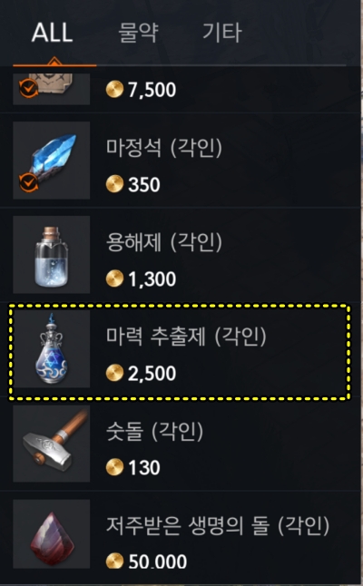 스킬북 분해는 상점에서 "마력 추출제(각인)"을 구매하면됩니다. 일반 용해제로는 스킬북 분해가안됩니다~!!!! 우선 마력 추출제 1개 구입해서 분해를 해보겠습니다.