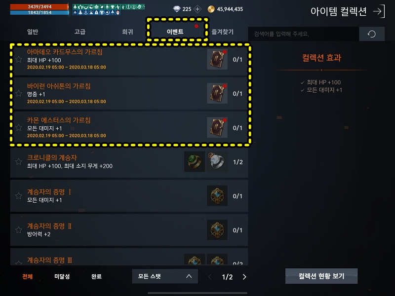 아덴 왕국 역사서로 등록하는 컬렉은 "컬렉션 -> 이벤트 - > 아마데오 카드무스, 바이런 아쉬톤 , 카몬 에스터스의 가르침" 이렇게 3개의 컬렉션입니다. 저는 오브라서 명중이 너무 부족하니 바이런 아쉬톤의 가르침 명중+1 컬렉션을 제일 먼저 등록했습니다. 다음 아덴 왕국 역사서가 준비되면 모든 대미지 +1을 등록하려구요.